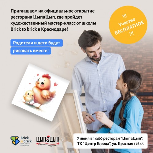 7 июня приглашаем на официальное открытие ресторана «ЦыпаЦып», где пройдет художественный мастер-класс от школы Brick to brick в Краснодаре!